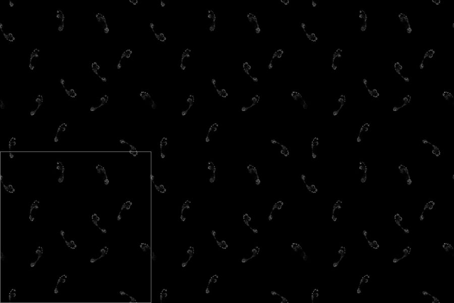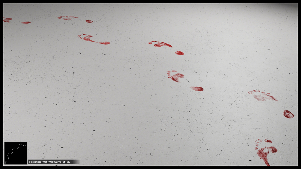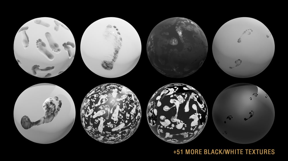 A large collection of seamless and non-seamless, black and white, 3D textures of footprints. For masks, alphas, roughness, bump, etc.